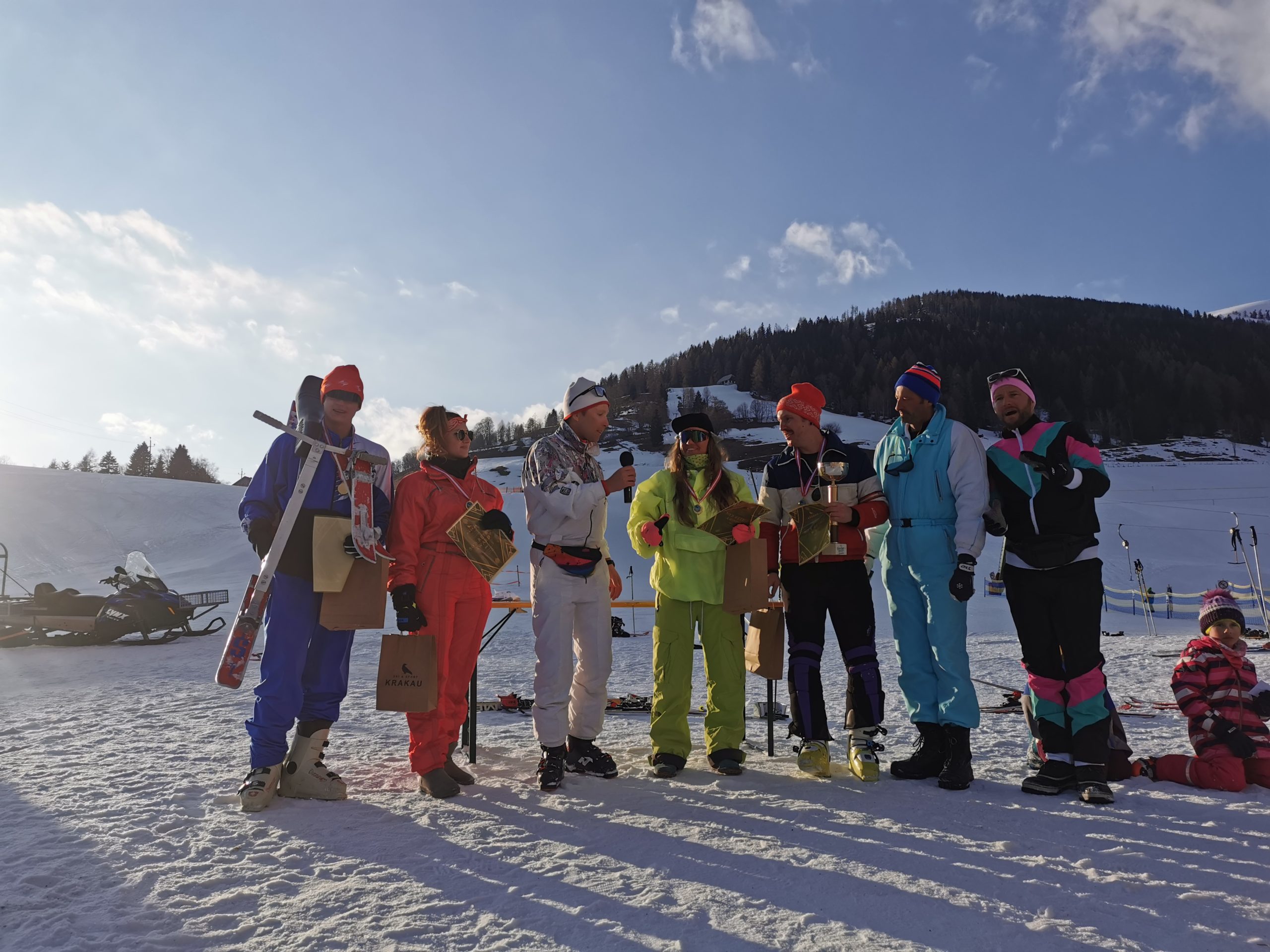 Die Siegerehrung fand im Anschluss an den “Gaude Lauf” und freiem Skifahren mit den Retro Sportgeräten statt. Premiert wurden neben den Sieger:innen der Mittelzeitwertung auch das beste 80´s Outfit, das coolste Vintage Sportgerät und der “größte Brezn”.